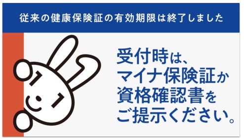 マイナ保険証について 2026.04.04 従来の健康保険証の有効期限は終了しました。 医療機関・薬局の受付では、マイナ保険証をお持ちの方は「マイナ保険証」を、お持ちでない方は「資格確認書」をご提示ください。 ※資格確認書をお使いの方も、利用登録いただければ、マイナ保険証の利用が可能です。ぜひメリットの多いマイナ保険証のご利用をお願いします! マイナ保険証クイックガイド Post Share LINE RSS note この記事のタイトルとURLをコピーする 泌尿器科外来 診療日変更(4/18→4/25)のお知らせ 前の記事
