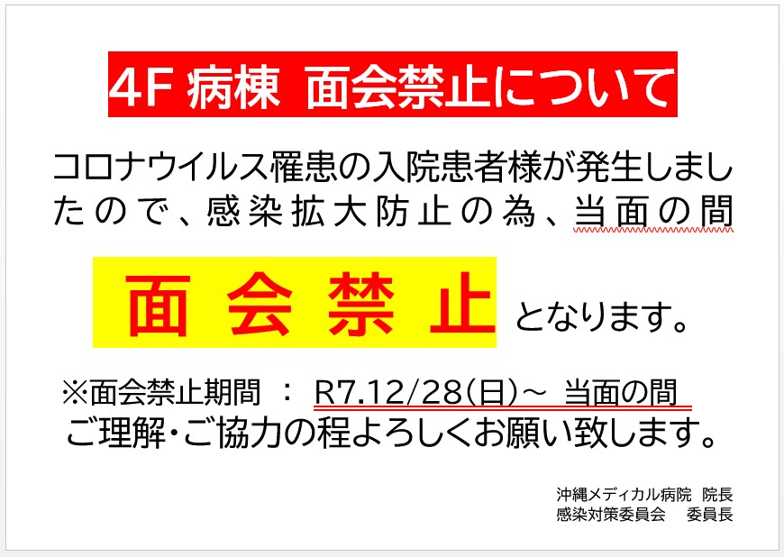 4F病棟面会制限(12/28~)についてお知らせ→→1/2(金)制限解除 2025.12.29 面会制限解除(1/2~) Post Share LINE RSS note この記事のタイトルとURLをコピーする 年末・年始 ご面会につきまして 前の記事